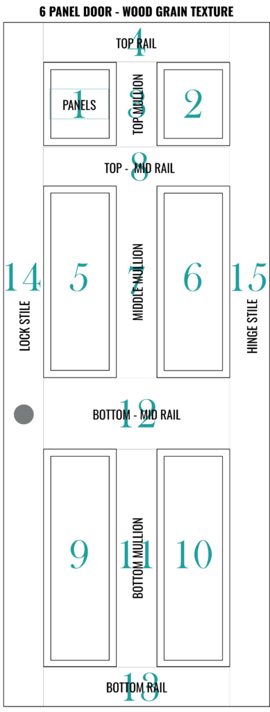 Using the same process, we are going to continue painting the entire face of the door in the following order: the middle-left panel, middle-right panel, middle mullion, top – mid rail, bottom – left panel, bottom – right panel, bottom mullion, bottom – mid rail, bottom rail, lock style, and finally the hinge style.